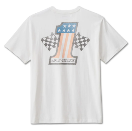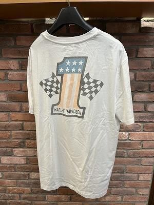 ハーレーの#1レーシングのロゴをプリントしたTシャツ。褪せたような加工がされているため、ヴィンテージ感のあるTシャツになっています。